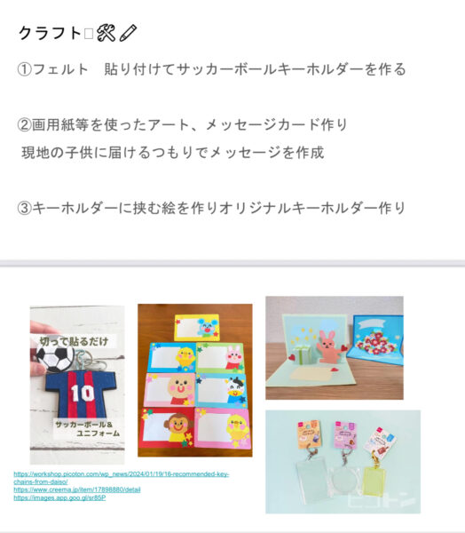 内容:児童労働についての授業を聞いて、クラフト作業を会議室にて行い、第2セレステにてフェアトレードボールを使ったサッカーのレクリエーションを行います。