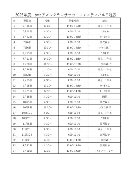以下、昨年のtotoアスルクラロサッカーフェスティバルの延期分を開催することとなりましたので参加ご希望の方は以下よりお申し込み下さい。