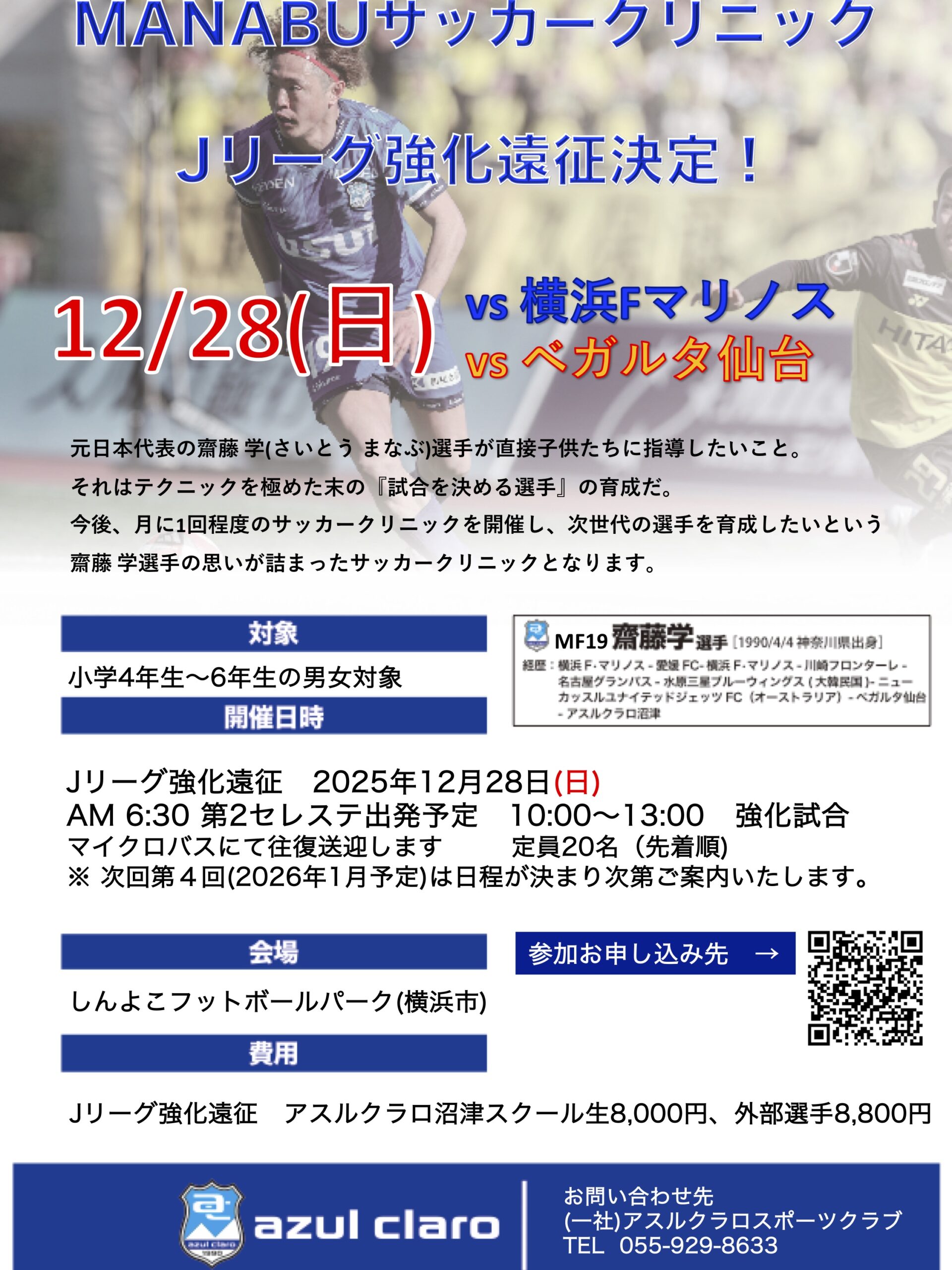 12/28(日)MANABUサッカークリニック Jリーグ強化遠征参加募集!